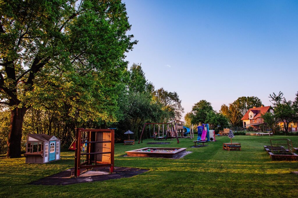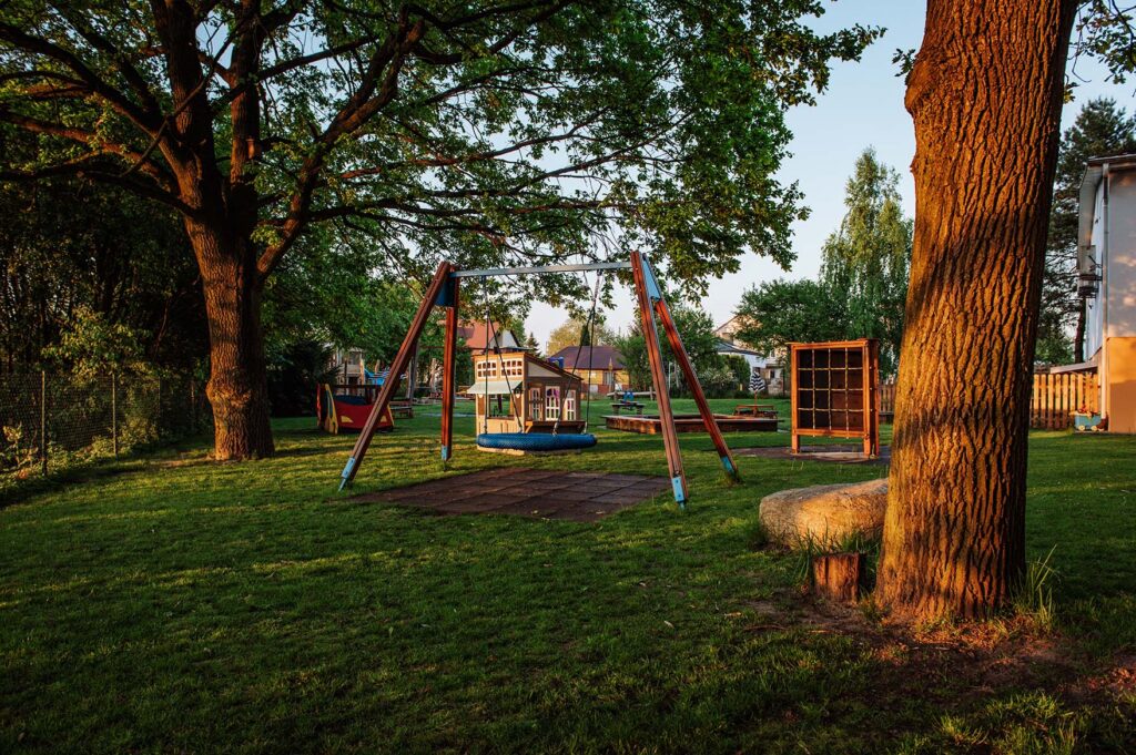 - Bliskość natury każdego dnia – zamiast betonowych placów zabaw mamy rozległą zieloną przestrzeń ze starymi drzewami, trawą, pagórkami i naturalnym terenem. Dzieci harcują na drewnianych konstrukcjach, bawią się w dużej piaskownicy, biegają i eksplorują wśród krzewów – autentyczna zabawa na świeżym powietrzu, którą podsuwa sama przyroda.